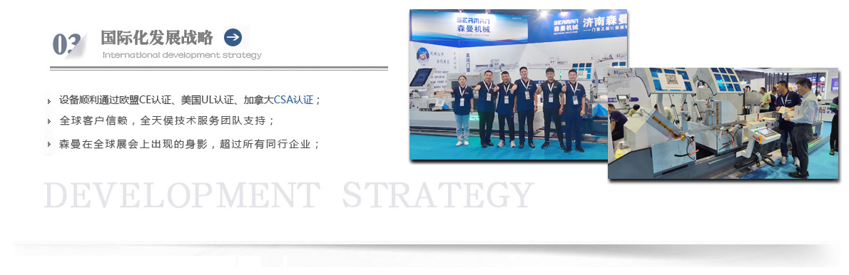 “森曼機(jī)械”作為全球門窗設(shè)備供應(yīng)商,本著"seaman"精神,勇立潮頭,拼搏創(chuàng)新,以爭做行業(yè)為目標(biāo),在行業(yè)前輩發(fā)展的基礎(chǔ)上,努力學(xué)習(xí),積極進(jìn)取。目前公司產(chǎn)品涵蓋塑料門窗設(shè)備、鋁合金門窗設(shè)備、鋁幕墻設(shè)備、鋁木復(fù)合門窗設(shè)備及中空玻璃設(shè)備五大種類,近百個(gè)品種。公司產(chǎn)品銷售至全國各地及東南亞、非洲、東歐、北美等幾十個(gè)國家和地區(qū)。在這個(gè)競(jìng)爭激烈的年代,我們正努力使我們的產(chǎn)品!
